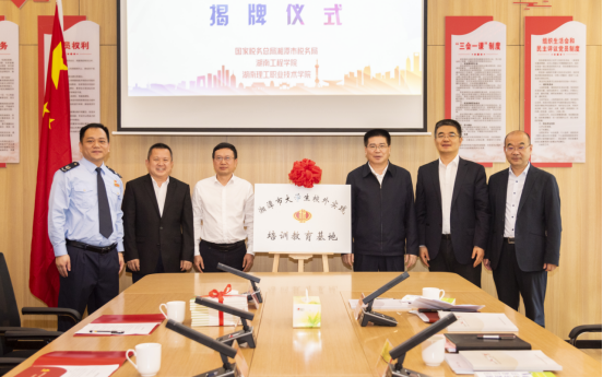 4月23日,湖南首个“大学生校外税务实践培训教育基地”在湘潭市“市民之家”办税服务厅亮相。国家税务总局湖南省税务局党委书记、局长曾光辉,国家税务总局税收宣传中心副主任任鹏飞,湘潭市委常委、市人民政府常务副市长刘新华,beat365党委委员、副院长罗毅平共同见证“湘潭市大学生校外税务实践培训教育基地”揭牌。