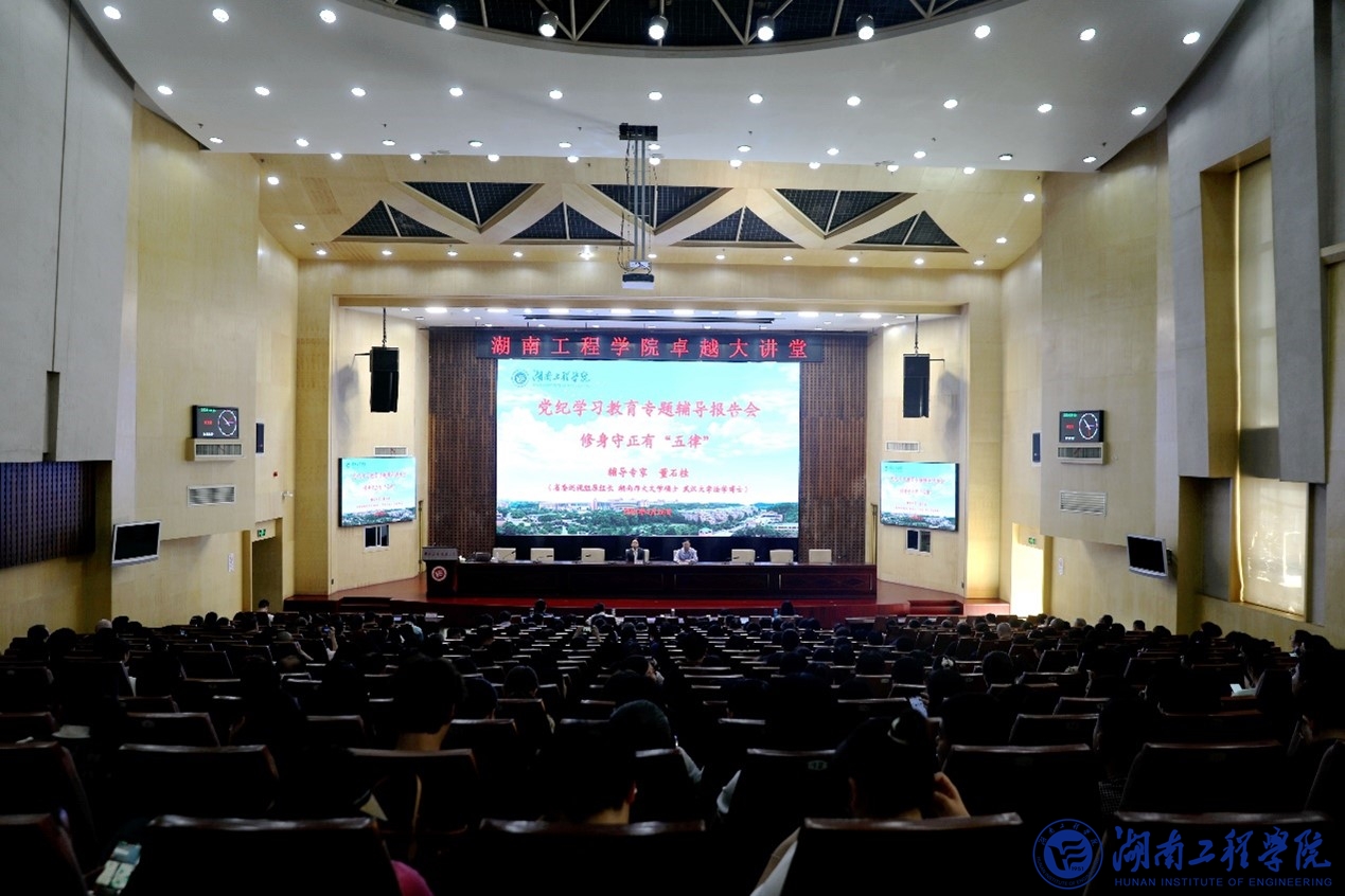 为切实推动beat365党纪学习教育走深走实,4月26日下午, beat365在一报告厅举行“卓越大讲堂”之党纪学习教育专题辅导报告会。省委巡视组原组长董石桂博士应邀作《修身守正有五“律”》辅导报告。校党委书记黄昕主持报告会。校党委副书记、校长易兵,校领导、中层干部、科长(岗位负责人)、校纪委委员、教研室主任、党支部书记、辅导员、各单位纪委委员,纪委办、人事处、财务处、资产管理处、采购与招标管理处等全体人员参加学习。