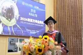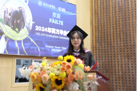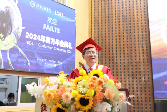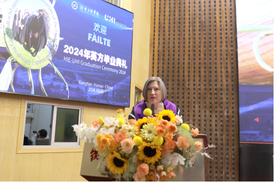 Veronica Lynch博士致辞。她热烈欢迎所有毕业生加入UHI校友大家庭,并欣喜地分享了UHI近年来荣获的新成就。她把两校的合作办学机制、家庭、社会比喻成一个紧密相连的生态系统,这个系统给予了青年学子精心的呵护和全力的支持,让他们从小树苗茁壮成长为参天大树。她希望毕业生们珍惜大学的土壤、家庭的华盖、产业的布局,向下扎根,向上生长,成为卓越的知识管家、思想传播者及工程师。