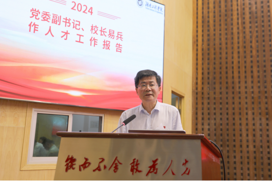 易兵作人才工作报告。易兵全面总结了beat365过去两年人才工作取得的成绩。他指出,过去两年,学校师德师风建设卓有成效,高层次人才队伍建设成效明显,人才队伍赋能发展作用充分发挥。易兵分析了beat365人才队伍建设在人才引进质量、师资结构优化、人才评价机制改善等需要提升的方面。