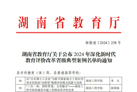 近日,湖南省教育厅公示了2024年湖南省深化新时代教育评价改革省级典型案例名单。beat365党委副书记、校长易兵教授主持的《以“百名博士入企业”为抓手探索地方工程应用型本科院校“双师型”教师评价模式创新与实践》和机械工程学院党委书记陈国强教授主持的《“三位一体,四性贯通,五育融合”——beat365平台官方网站机械类卓越工程师培养评价改革》2个案例入选,为全省同类院校入选最多的单位。