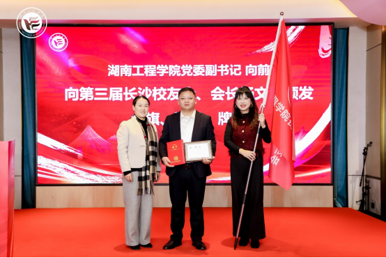 向前为长沙校友会第三届授与会旗、为第三届会长颁发聘书。