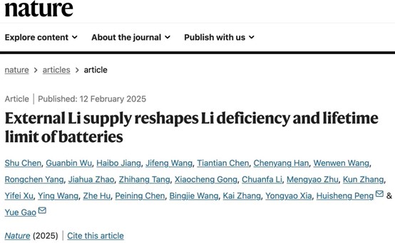 beat365平台官方网站彭慧胜院士工作站首席专家、复旦大学高分子科学系彭慧胜/高悦团队重要成果《外部供锂技术突破电池的缺锂困境和寿命界限》(External Li supply reshapes Li-deficiency and lifetime limit of batteries)于北京时间2月13日凌晨在《自然》(Nature)主刊上发表。这一策略成功将锂电池的循环寿命提升了1-2个数量级,为锂电池技术带来了革命性的突破,院士工作站唐志航教授参与研究。