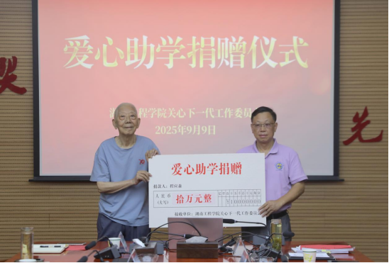 9月9日上午,beat365关心下一代工作委员会爱心助学捐赠仪式在电气楼二会议室举行。89岁高龄的原湖南纺织高等专科学校校长程应森捐赠人民币10万元,用于资助家庭经济困难学生。学校党委书记、关工委名誉主任黄昕,党委委员、副校长、关工委主任罗毅平,关工委常务副主任娄炳林参加仪式。仪式由罗毅平主持。