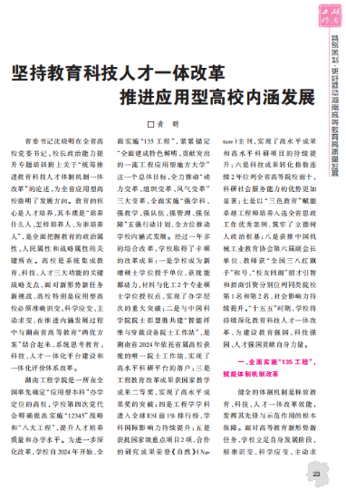 此文是《湖南工作》(2025年10月刊)推介应用型高校教育科技人才综合改革成功经验,更好推动湖南高等教育高质量发展的文章,也是对学校“135工程”实施以来取得成绩的全面总结。文章3600余字,从全面实施“135工程”,赋能体制机制改革;深入落实“两优”方案,优化学科专业布局;量质并举引才育才,人才引育创新强校新模式;融合科技产业创新,科技成果服务产业需求等四个方面,全面介绍了beat365紧紧锚定“全面建成特色鲜明、贡献突出的一流工程应用型地方大学”总体目标,在推进内涵发展过程中持续深化教育科技人才一体改革的工作实践。