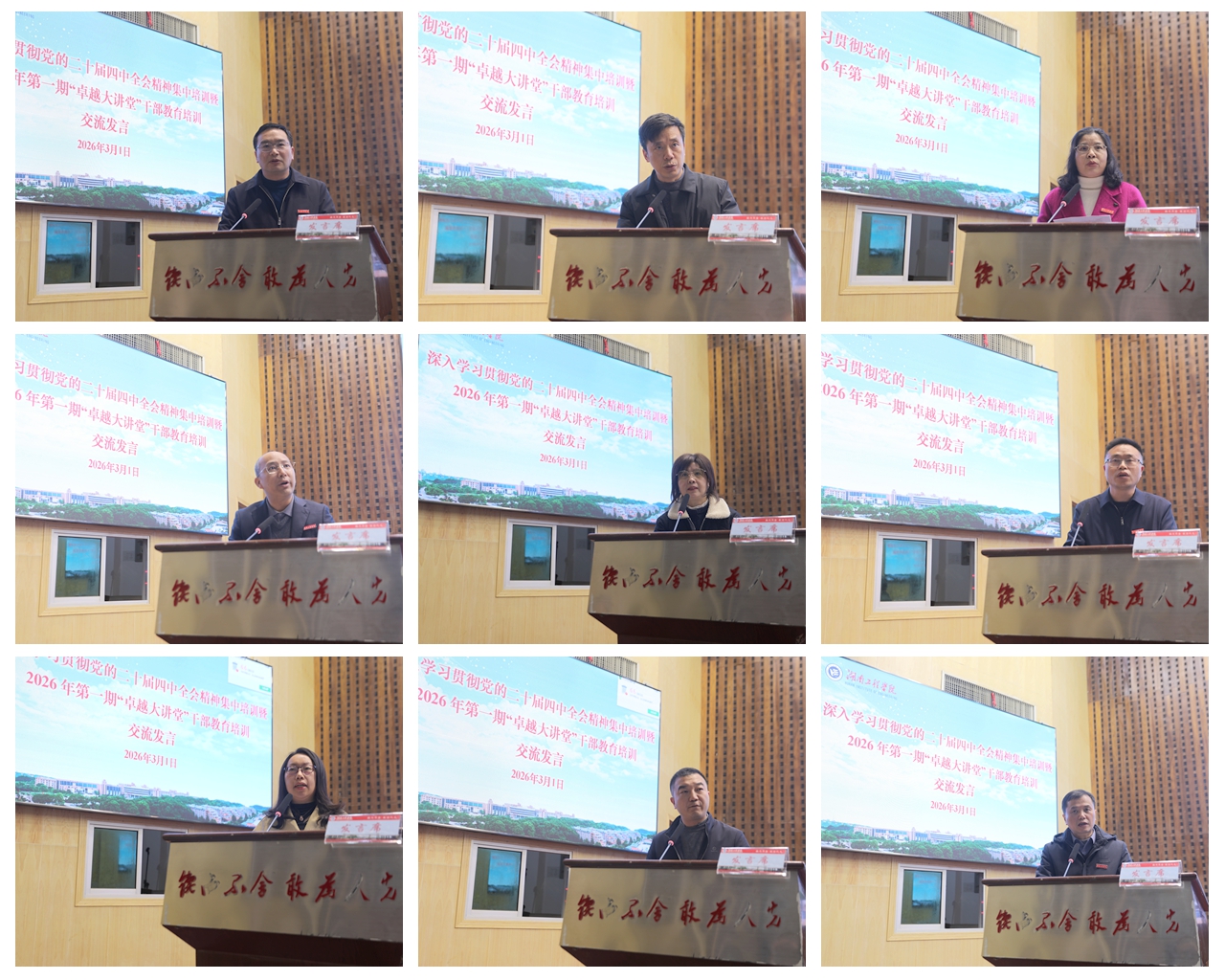 3月1日上午,总结交流会在一报告厅举行,全体在校校领导、中层干部、科级干部、专干、教研室(实验中心)主任及党支部书记参加。会议由校党委委员、组织部部长曾永卫主持。9个小组的发言代表依次登台,围绕学习收获、小组研讨成果以及如何将全会精神转化为推动学校“十五五”高质量发展的具体行动,畅谈学习体会,明确工作决心,亮出具体举措。