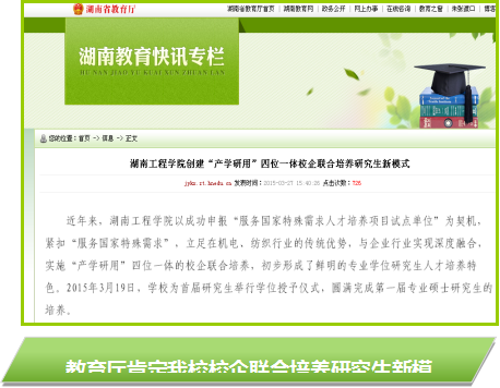 深化产教融合,打造育人共同体。自教育部部署研究生教育综合改革以来,学校坚持深化科教、产教融合,坚持与地方开展联合培养,已形成以需求为导向的产教融合育人长效机制。学校将湖南省重点实验室、湖南省工程研究中心、湖南省科技创新团队等平台作为研究生培养的重要载体,实现了科技创新与人才培养的有机结合。与省内外近30余家单位签订了联合培养协议,共建研究生实践基地,形成了实践教学基地群。学校将继续深化产教融合育人机制,大力推进专业学位研究生培养模式改革,打造更加开放的创新人才培养体系。