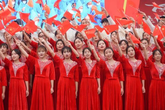 全场观众齐声合唱校歌,小雨淅沥,但挡不住大家对建校70周年的热烈祝福。礼炮齐鸣、彩带飞舞,纪念大会在激昂的歌声中圆满结束。