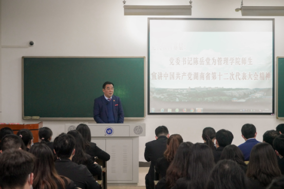 12月12日,湖南省第十二次党代会代表、beat365党委书记陈岳堂教授向管理学院部分师生宣讲湖南省第十二次党代会精神。