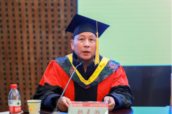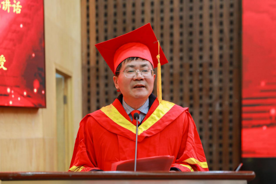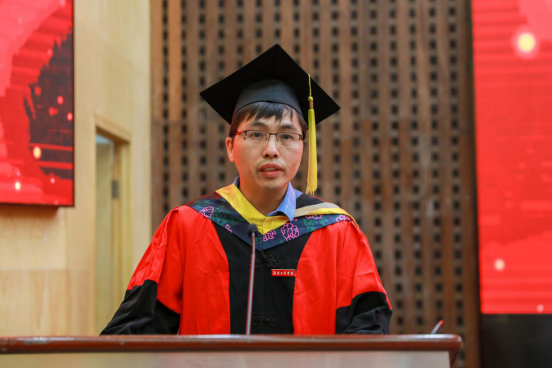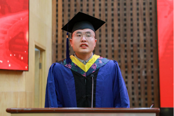 硕士研究生导师代表黄峰结合自己的科研与育人经历,鼓励同学们在接下来的日子里要勇于挑战科技创新,努力攻克技术难关,为全面建设社会主义现代化强国贡献青春力量。优秀毕业研究生代表李猛回顾了在湖工的精彩点滴,并深切表达了对母校培养、老师教导的感激之情。在校研究生代表蒋芊芊对将要踏入社会的毕业生们送出了美好的祝福,并表示将会继续秉承他们求真务实的科研作风、虚怀若谷的学习态度和革故鼎新的创新精神,在今后的求学生涯中用实际行动来传承“锲而不舍、敢为人先”的湖工精神。