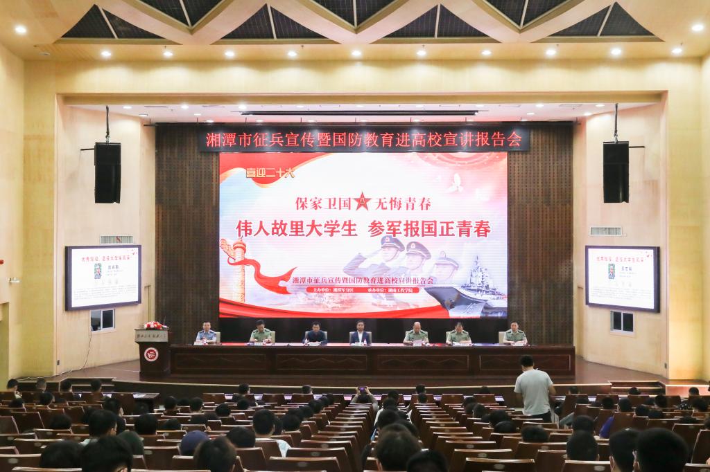 5月23日下午,湘潭市2022年征兵宣传暨国防教育进高校宣讲报告会在beat365一报告厅举行。湘潭市市委常委、常务副市长、市征兵工作领导小组组长吴志雄,beat365党委委员、副校长、校征兵工作领导小组副组长张小刚,军分区动员处上校处长、市人民政府征兵办公室主任龚政军,雨湖区人武部上校部长曾力真,岳塘区人武部上校、政治委员胡轶飞,学校人民武装部全体成员及各二级学院副书记在主会场参会。会议由湘潭军分区大校、政治委员黄献国主持。