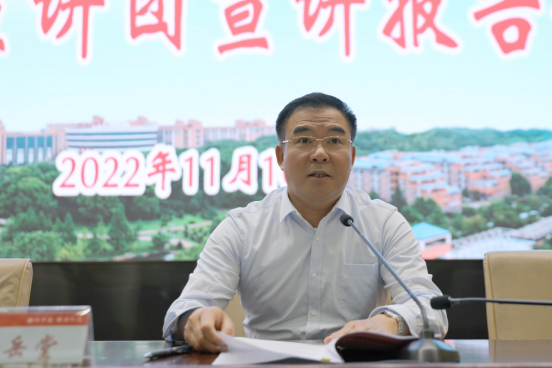 陈岳堂在主持报告会时说,要把传达好、学习好、宣传好、贯彻好党的二十大精神作为学校当前和今后一个时期的首要政治任务,结合持续深入学习习近平新时代中国特色社会主义思想,坚决捍卫“两个确立”,增强“四个意识”,坚定“四个自信”,做到“两个维护”,始终沿着习近平总书记指引的方向前进。要全面加强理论武装,学懂弄通做实习近平新时代中国特色社会主义思想,原原本本学习研读党的二十大报告和党章,认真领悟党的二十大提出的新思想新论断、作出的新部署新要求。要坚持以上率下、上下联动,压实主体责任,形成党委引领学、干部带头学、党员系统学、师生全面学的浓厚氛围。要推动学习成果转化,精心安排部署,周密组织实施,不断将学习宣传贯彻党的二十大精神融入学校办学治校的全过程、各方面,更加昂扬地奋力开创学校高质量内涵式发展新局面。