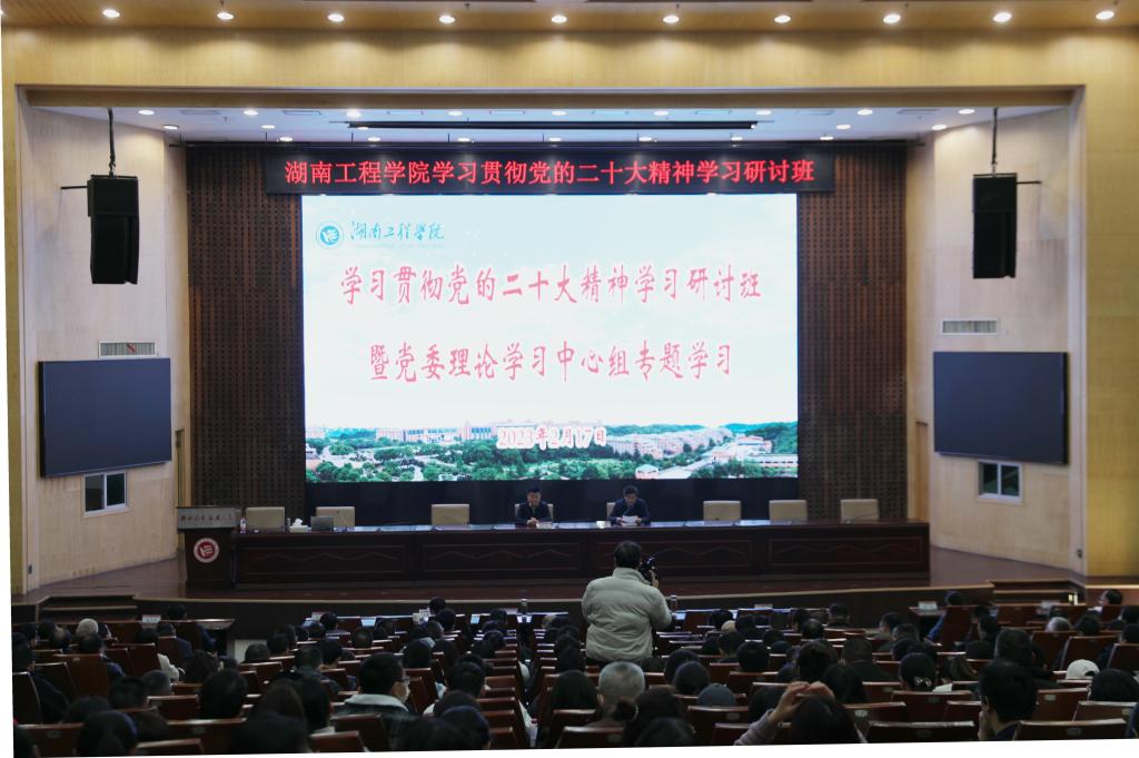 2月17日下午,beat365学习贯彻党的二十大精神学习研讨班第六讲暨党委理论学习中心组第三次集中学习会在一报告厅,培训邀请湖南省社科院党组书记、院长钟君来校作主题为“开辟马克思主义中国化新时代新境界”的专题辅导报告。校党委副书记、校长易兵主持报告会。在校校领导、党委委员、中层及以上干部,科级干部、岗位负责人,辅导员、马克思主义学院全体教师,专职组织员参加学习。