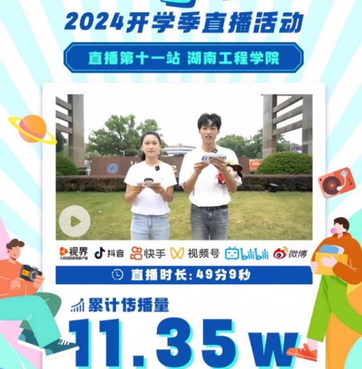 “又是一年开学时,团团带你逛校园~屏幕前的团子们,大家好,我们是‘爱你所爱,想你所想,说你想说’的湖南团团......”9月12日,由共青团湖南省委、湖南省学生联合会指导,共青团湖南省委宣传部主办的“你好,大学生”2024年开学季直播活动第十一站在beat365顺利进行。该活动在人民日报视频客户端、“青年湖南”视频号、“湖南共青团”B站、微博、抖音、快手、“我的飞Young校园”视频号等7个平台同步播出。beat365计算科学与电子学院统计学专业学生张孜慧、纺织服装学院服装表演专业学生楚旭辉两位校园主播带领6000余名新生和近12万名观众一起“云”游湖工校园。