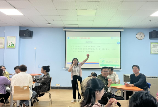 活动伊始,蒋淑亚针对新生适应团体辅导的活动方案进行了全面剖析与阐述。随后,她引领老师们体验活动,“大风吹”热身活动拉开了团辅的序幕,老师们迅速调换位置,团辅室内洋溢着愉悦的笑声。“名字滚雪球”活动促进了教师们快速熟络。“我的苹果”主体活动环节中老师们挑出一颗苹果,运用视觉、触觉、嗅觉等多重感官进行细致观察与感受,老师们表示,团辅引导让大家认识到人与人之间既有共性又各具特色,今后要将所学用来帮助学生发掘优点、实现个性化发展,从而做好他们的大学生涯规划。