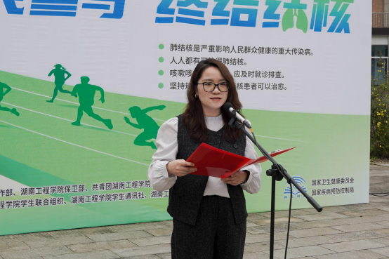岳塘区疾病预防控制中心副主任罗肃倡导大家积极投身结核病防治事业,关心关爱结核病患者,用爱与行动守护健康,如期实现无结核校园、终结结核病流行的宏伟目标,为保护广大师生及人民群众生命安全和身体健康倾尽心力,为推进健康湘潭建设书写新的辉煌篇章。