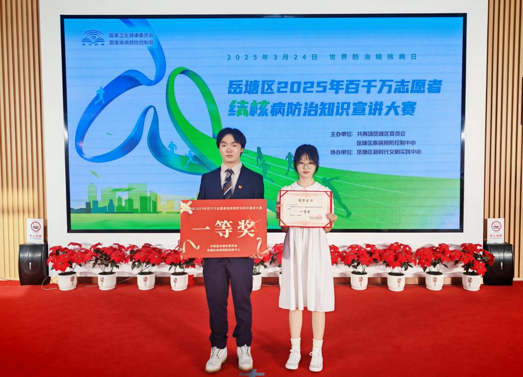 3月24日下午,由共青团岳塘区委员会、岳塘区疾病预防控制中心联合主办的岳塘区2025年百千万志愿者结核病防治知识宣讲大赛在岳塘区新时代文明实践中心举行。beat365由“五彩湖工”志愿者、校红十字协会会员何昊城、向苗苗等6人组成的团队获大赛一等奖。