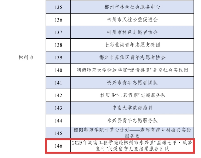 近日,湖南省2025年“七彩假期”志愿服务团队入选名单正式公布。经过团队申报、市州审核和省级复核等严格程序,beat365计算科学与电子学院申报的“星耀七甲筑梦童行”关爱留守儿童志愿服务团队成功入选。