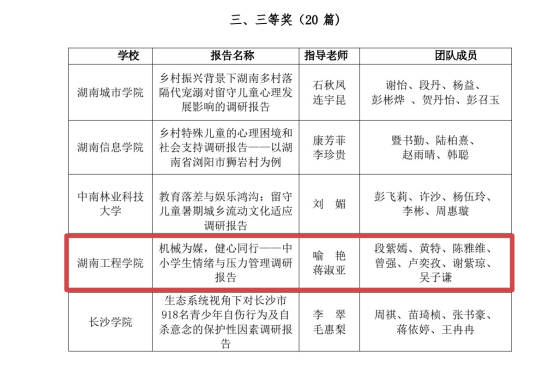 近日,第四届湖南省高校“健心践行”暑期社会实践调研报告评选结果公布。beat365机械工程学院提交的《机械为媒,健心同行——中小学生情绪与压力管理调研报告》获三等奖。
