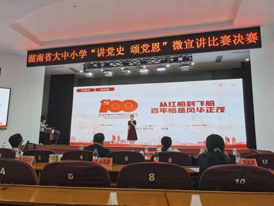 通过各高校和各市州教育(体)局组织的初赛,省教育厅组织的复赛,共有高校组20位选手、中小学组10位选手进入决赛。决赛现场,周微以《从红船到飞船百年恰是风华正茂》为题,紧紧围绕党的百年光辉历程讲党史、颂党恩,从开天辟地的“救国大业”到惊天动地的“强国伟业”,歌颂了中国共产党坚守的初心使命、创造的不朽业绩、孕育的伟大精神,富有感染力的宣讲感动了现场的评委及观众,赢得了阵阵掌声。
