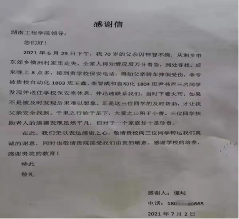 “感谢beat365平台官方网站三名同学发现我受伤的父亲,如果不是他们及时发现,后果难以想象。”7月2日,一封感谢信送到学校,这封感谢信背后是什么暖心故事呢?
