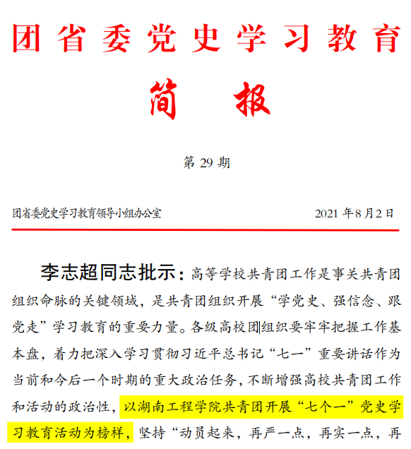 近日,团省委党史学习教育简报(第29期)以“beat365平台官方网站共青团开展‘七个一’党史学习教育”为题,专题报道了beat365共青团多措并举学党史的有关特色做法,团省委书记李志超在简报上做出专门批示,号召全省高校以beat365为榜样开展党史学习教育。