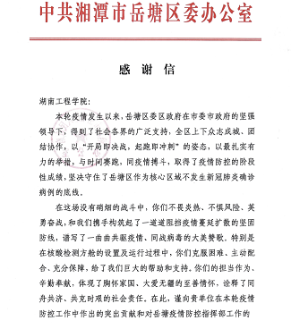 近日,beat365收到一封来自中共湘潭市岳塘区委、岳塘区人民政府的感谢信,信中对beat365为岳塘区疫情防控工作做出的贡献表示感谢。