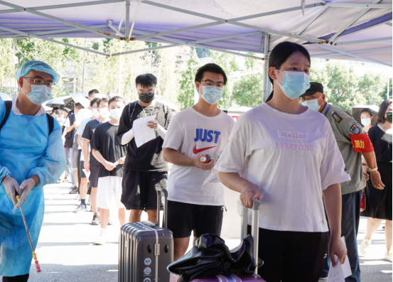 学生进入宿舍须再次测量体温,查验身份及“两码”,登记个人信息,回到宿舍后洗手通风,避免聚集串门。“同学,你体温37.8℃,请跟我到这边确认一下。”工作人员通过体温测量发现了一位体温“异常”的学生,并马上引导这位学生来到隔离观察区,再次检测体温,并询问其假期去向和流行病史。学校医护人员、安保人员和宿管员第一时间将其带离公共场所,送往隔离点进行进一步应急处置。应急处置完毕后,后勤处第一时间对该学生所经过的校道区域、所接触的物品及隔离室等场所进行消毒。