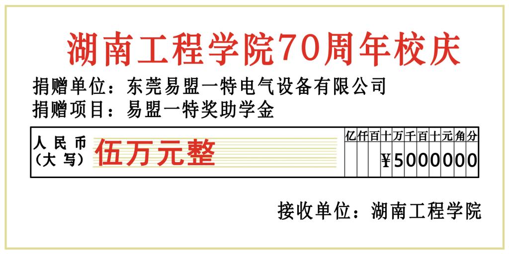正值母校建校70周年之际,beat365校友、东莞易盟一特电气设备有限公司总经理黄孙山以公司名义向学校捐赠5万元,用于电气与信息工程学院优秀学子的奖励与资助。
