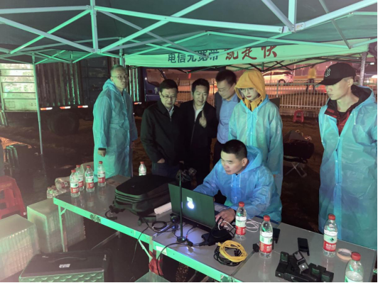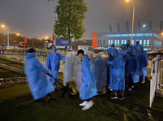 10月14日中午下起了雨,志愿者们给无人机一一盖上防水盒,到表演的时候再一个一个地掀开。工作很繁琐,气温也比较低,大家不厌其烦地重复着这些动作,任由冰冷的雨水划过脸庞,在大家的全力配合下,顺利完成了彩排。当晚,罗毅平、张小刚、向前等校领导前往田径场了解无人机的准备情况,亲切慰问志愿者,并竖起大拇指为他们的奉献精神点赞。