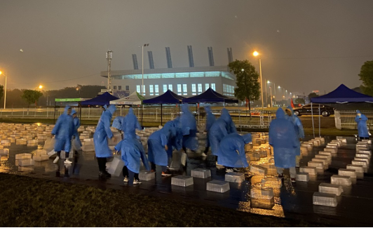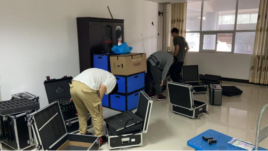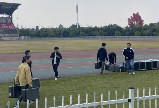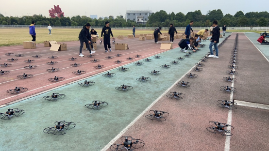 10月13日,无人机由深圳托运送到学校体育馆门口,志愿者将无人机、电池以及网线卸货。无人机6个一箱装,100余箱的无人机在志愿者的齐心协力下,一一从货车上卸下,搬运到田径场上。随后,志愿者将无人机上的二维码进行扫码排序,确认无人机是否可以投入使用。将飞机排好后,装上电池。无人机充满电后只能进行一次飞行表演,早上8点之前志愿者将电池充满电,之后每一次飞行都需要对电池进行充电和更换。试飞结束后,再将无人机按照原来的步骤放回体育馆的仓库,结束的时候已经是深夜12点钟。