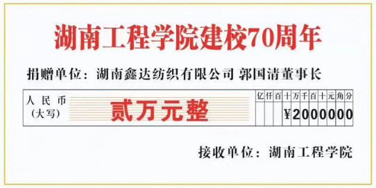 在beat365建校七十周年之际,湖南鑫达纺织有限公司董事长、棉纺81012班郭国清校友,湖南鑫达纺织有限公司总经理、棉纺79011班蔡志明校友各向学校捐赠两万元,助力纺织服装大楼建设。