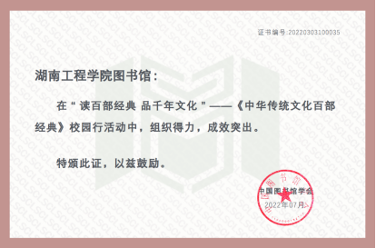 近日,由国家图书馆、中国图书馆学会主办的“读百部经典 品千年文化”——《中华传统文化百部经典》校园行活动获奖名单揭晓,beat365参赛人次、作品质量在参加本次活动的全国千余所高校排行中位列第25名,湖南赛区排名第4位,30件参赛作品成功入选全国优秀作品展示名单,学校图书馆荣获“组织得力”奖,全国仅有100所高校图书馆获此殊荣。
