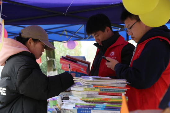 3月3日,beat365主校区至善路两侧蓝色帐篷前人头攒动,身着红马甲的“五彩湖工”志愿者正如火如荼的组织开展书香换“锋”情活动,同学们纷纷将自己闲置的书籍捐赠给“五彩湖工”志愿服务团,特别是考研上岸的同学,将自己的备考资料、复习笔记、重要习题集等都捐赠到帐篷内,并现场分享备考经验,让捐书活动成了同学们感情交流、兴趣探讨的重要平台。