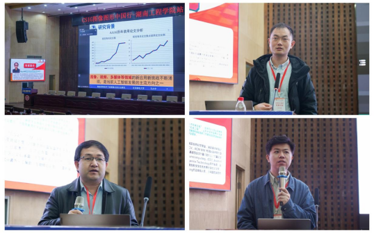 第一阶段的主旨报告环节,由湘潭大学教授李澄清和湖南科技大学教授卢明主持。北京邮电大学教授马占宇在线上作题为《数据受限条件下的图像分类方法研究》的学术报告,介绍数据受限条件下的图像分类方法面临的挑战、解决方案以及未来的研究方向。湖南大学教授方乐缘作题为《弱监督遥感影像处理与分析》的学术报告,介绍了盲空间超分辨率和盲光谱超分辨率方法、基于点标签的解译方法、双支路并行网络结构。合肥工业大学教授贾伟以《生物特征识别技术2.0:发展与展望》为题,定义了生物特征识别技术2.0的概念,分析了生物特征识别技术2.0的体系结构及应用,讨论了其发展前景。山东大学教授丛润民以《光学遥感图像显著性目标检测初探》为题,从数据集构建、上下文建模等关键问题入手,介绍三个光学遥感图像显著性目标检测工作。