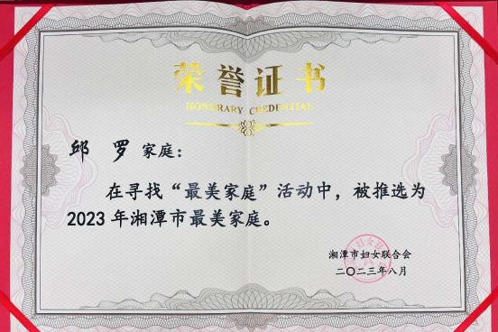 10月20日,市妇联联合市文明办举办的湘潭市“情暖重阳话家风”家庭文明建设暨“湘潭市最美家庭”“湖南省文明家庭”颁奖活动在市总工会举行。活动现场揭晓了30户在孝亲、书香、清廉、绿色等方面有突出事迹的最美家庭。beat365教师邱罗家庭荣获2023年湘潭市“最美家庭”荣誉称号。