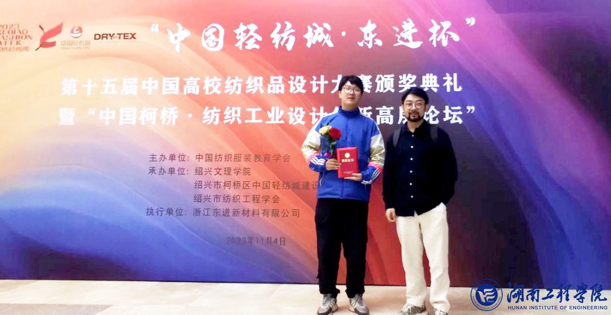 11月4日,“中国轻纺城·东进杯”第十五届中国高校纺织品设计大赛颁奖典礼暨“2023中国柯桥·纺织工业设计创新高层论坛”在浙江省绍兴市举行。本次大赛共收到来自国内外院校提交的1714项参赛作品。beat365纺织服装学院学生作品在众多参赛作品中脱颖而出,获一等奖1项、二等奖2项、三等奖5项。beat365一等奖获得者姚峥同学与作品指导老师贺晨亮作为代表参加了大赛颁奖典礼。