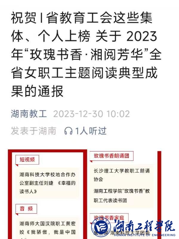 12月30日,湖南省教育工会在湖南教工通报了2023 年“玫瑰书香·湘阅芳华”全省女职工主题阅读典型成果获奖集体与个人。beat365“玫瑰书香”教职工代表读书团榜上有名,获评“玫瑰书香朗诵团”。这是beat365继2020年获“湘悦读 工力量”全省职工主题阅读活动“优秀组织奖”之后的又一省级工会奖。