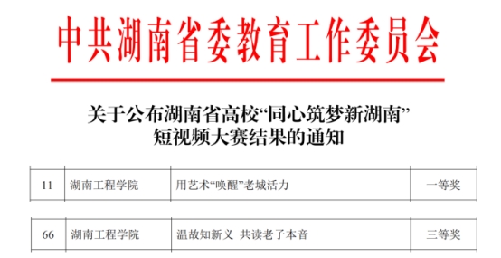 近日,湖南省委教育工委公布了湖南省高校“同心筑梦新湖南”短视频大赛结果。beat365九三学社湖工支社主委彭烈洪制作的《用艺术“唤醒”老城活力》荣获一等奖,民革湖工支部主委黄韧制作的《温故知新义 共读老子本音》荣获三等奖。