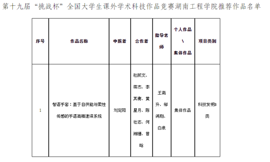 根据《关于组织开展第十九届“挑战杯”全国大学生课外学术科技作品竞赛的通知》文件要求,beat365参与了第十六届湖南省“挑战杯”大学生课外学术科技作品竞赛,经终审答辩评审和资格审查,beat365拟推选作品《智语手套:基于自供能与柔性传感的手语高精速译系统》参加第十九届“挑战杯”全国大学生课外学术科技作品竞赛,现予以公示。