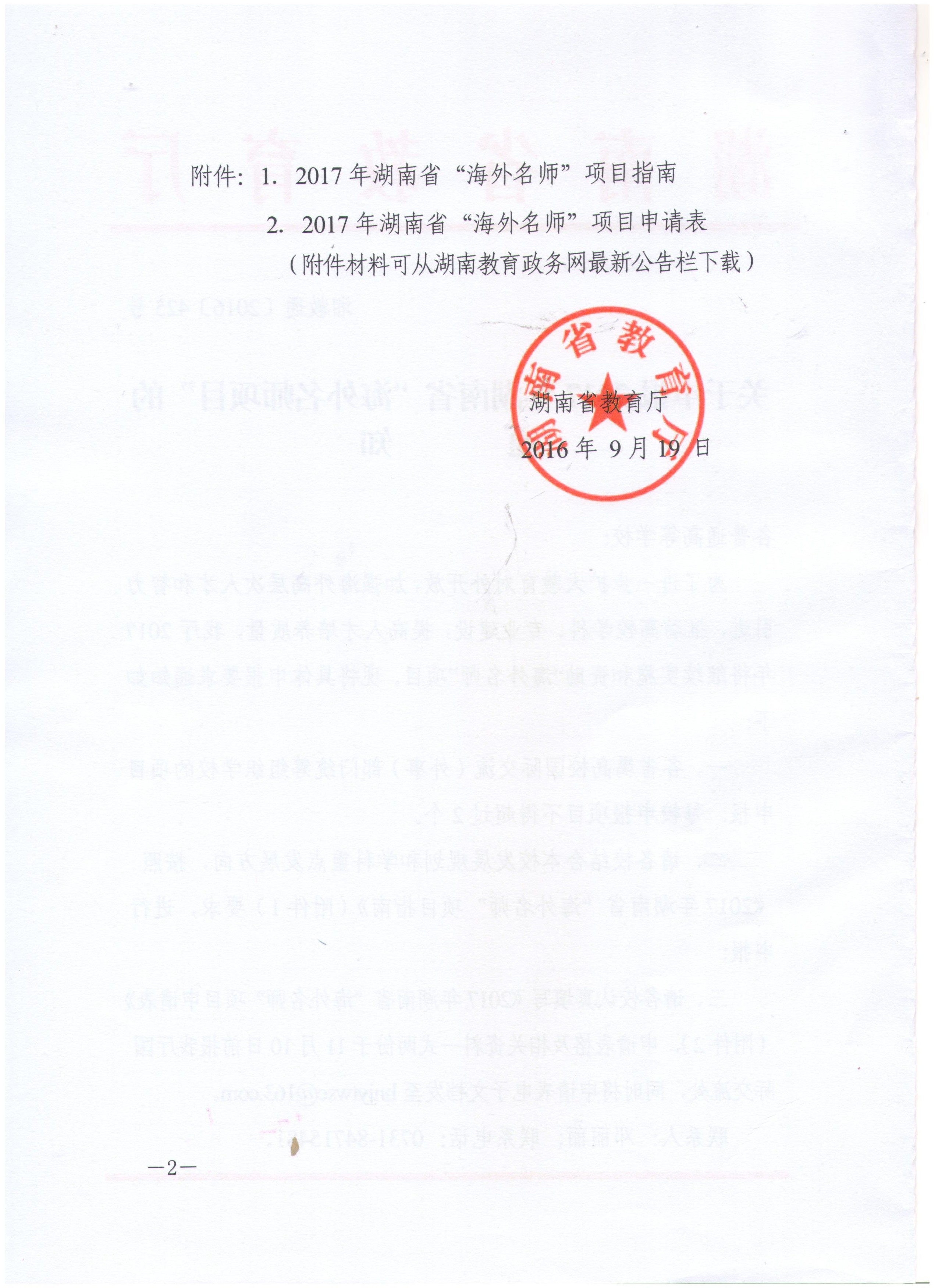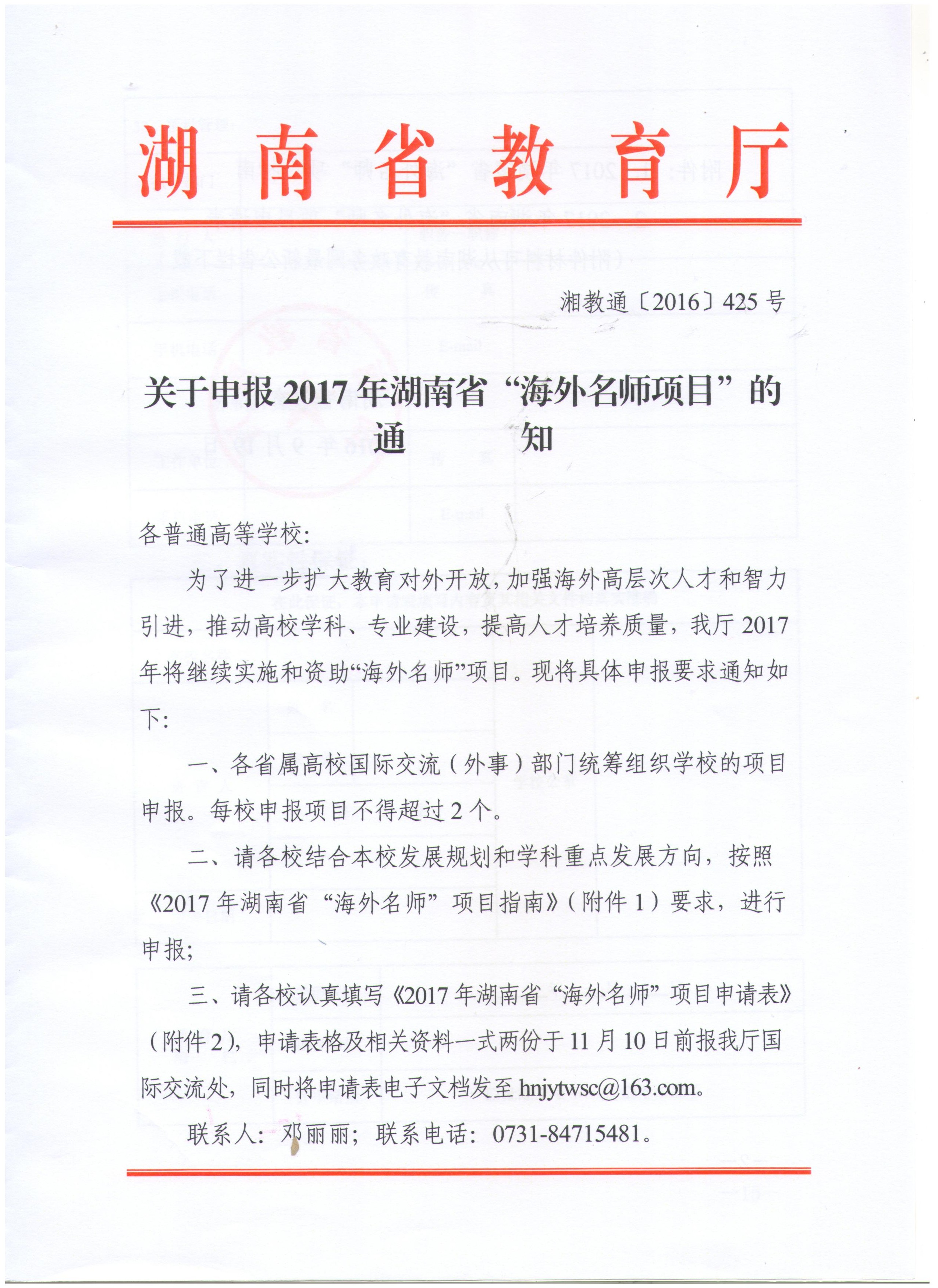 一、全校各学科专业结合自身发展规划和重点发展方向,按照《2017年湖南省“海外名师”项目指南》(附件)要求,进行申报。