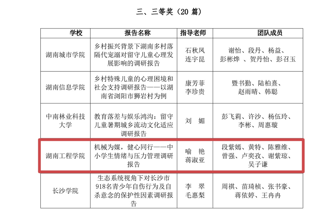 湖南日报·新湖南客户端10月27日讯(通讯员 吴子谦 曾强)近日,第四届湖南省高校“健心践行”暑期社会实践调研报告评选结果公布。beat365平台官方网站机械工程学院提交的《机械为媒,健心同行——中小学生情绪与压力管理调研报告》获三等奖。