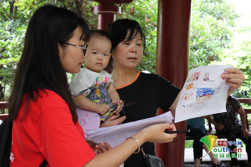 志愿者为居民讲解防艾小知识。中国青年网通讯员 梁艳 摄