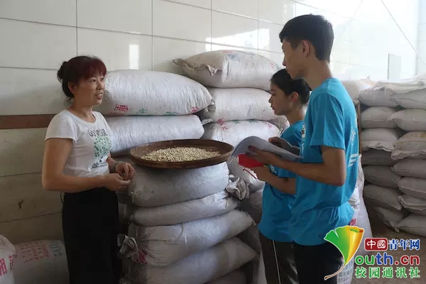 志愿者在雄达白莲有限公司驻花石办事处听管理员介绍公司的白莲销售,主要做哇哈哈的供应商,并充分利用当地市场销售。给我们介绍他们公司白莲的加工过程,攘括去壳、取芯、磨皮等过程。(中国青年网通讯员 田雨卓)