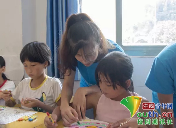 志愿者指导小朋友进行手绘贺卡的修饰。(中国青年网通讯员 邹振瑜 摄)