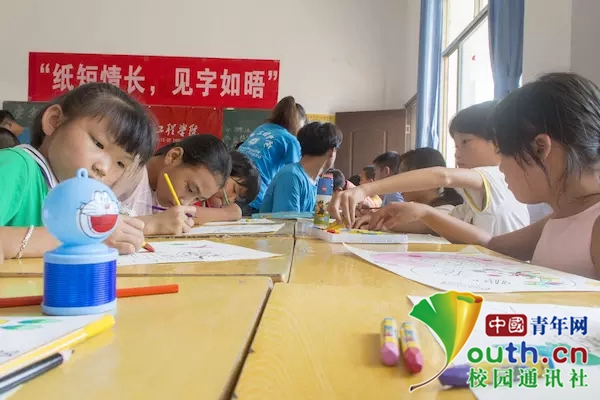 小朋友在认真的写贺卡。(中国青年网通讯员 邹振瑜 摄)