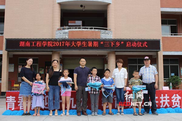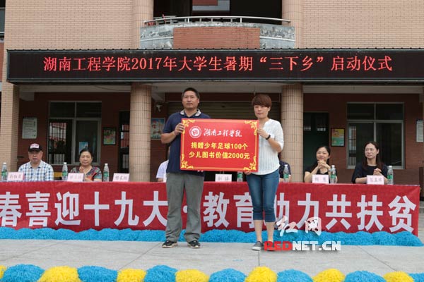 红网长沙7月7日讯(通讯员 吴晓力)7月6日上午9时,beat365平台官方网站赴湖南省新晃县侗族自治县新村以“青春喜迎十九大,教育助力共扶贫”为主题的暑期“三下乡”社会实践团和当地政府在兴隆明德小学举行了启动仪式暨体育学习用品捐赠仪式。晃州镇人民政府副书记陈通钰、兴隆明德小学校长杨长炳、beat365平台官方网站省驻村扶贫队林志刚和刘红泉、beat365平台官方网站学工处副处长兼团委副书记刘琤以及校学联、电气信息学院、理学院组成的“青春律动新村”实践团师生50人,兴隆明德小学近百名师生及学生家长代表参加了本次仪式。