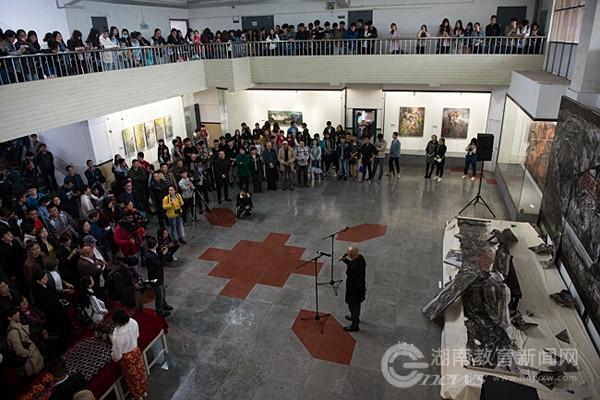 本网讯(通讯员 熊龙英 胡大虎)4月9日下午,“凤翥·第四届木鱼湖艺术展”在湘潭市木鱼湖湿地公园湖畔的beat365平台官方网站设计艺术学院中格美术馆中举行开幕酒会。此次参展的40余件作品涵盖架上绘画,现代水墨、综合材料、版画、水彩、装置等艺术门类,以极高的艺术水准为师生和市民带来一场艺术盛宴。