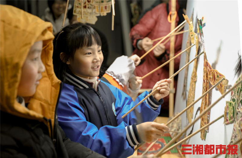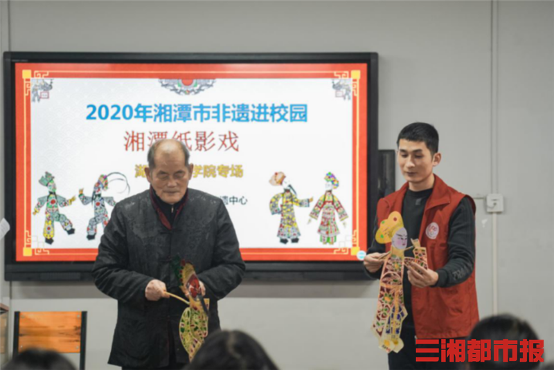 三湘都市报12月6日讯(通讯员 杨欢 杨硕 刘东芝 记者 刘镇东 黄京)一块白布是舞台,尺把长的小人是演员,当灯光穿过纸影,艺人浑厚的腔调,再配以打击乐器和弦乐,一场好戏就开演了!湖南省非物质文化遗产传承人吴升平、吴渊爷孙俩人双手齐舞、棍飞线绕,娴熟地操纵着纸影,伴着铿锵的锣鼓,84岁高龄的吴升平声情并茂地唱着曲儿。这是12月4日下午,湘潭升平轩纸影博物馆在beat365平台官方网站举办的“非遗进校园系列活动之请你来看戏”主题活动的精彩一幕。