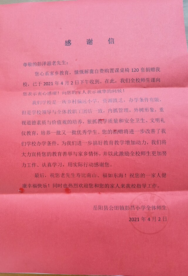 (湖南日报·新湖南客户端记者 周倜 通讯员 田瑶 潘硕)“彭泽滋老先生心系家乡教育,慷慨解囊自费购置课桌椅120套捐赠beat365,已于4月2日收到……”